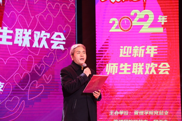 迎新年联欢会伊始,杨会良院长致辞,首先,他向刻苦求学、锐意进取的全体同学,认真负责、勤勉工作的全体教职工,一直以来关心支持学院发展的各位领导、各界朋友,致以最衷心的感谢和最诚挚的新年问候,并简要总结了管理学院2021年工作。他表示,2021年,是不平凡的一年,中国共产党成立一百周年,“十四五”开局之年,也是贯彻十九届五中、六中全会的落实之年,更是管理学院发展值得铭记的一年。一是学科专业建设实现新突破;二是人才和师资队伍建设成效显著;三是育人质量不断提升。2022年也将是重要的时间节点,这一年,中国共产党第二十次全国代表大会将要胜利召开,我校也将迎来四十年华诞,回顾过去,展望未来,我院将秉持“公共精神、博爱情怀、禀道毓德、厚学强术”办院理念,遵循“入主流、强特色、促融合、创一流”的指导思想,秣马厉兵,砥砺前行,做优残疾人事业管理人才培养,为建设国内一流、国际有影响的特殊教育师范本科院校书写管理学院奋进之笔,谱写浓抹重彩之华章,以优异的成绩,向党的二十大献礼!随后,他宣布联欢会正式开始。