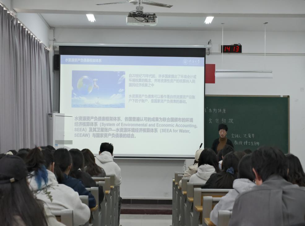 10月28日下午,管理学院特邀河海大学教授、博士生导师沈菊琴在江宁校区D410作题为“水资源会计初探”的学术讲座,本次讲座是“数智财务系列讲座”之一。讲座由财务管理系专业负责人孙海燕教授主持,吸引了120余名师生参加。