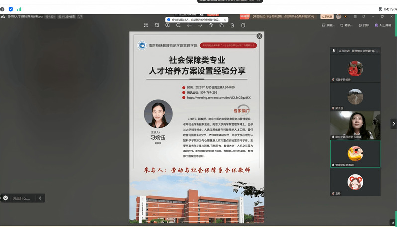 11月5日晚,南京特殊教育师范学院管理学院劳动与社会保障系以线上研讨会形式,成功举办“社会保障类专业人才培养方案设置经验分享”专题活动。作为该系“人才培养改革与创新”系列研讨的关键一环,本次分享会特别邀请南京中医药大学养老服务与管理学院习婉钰副教授主讲,劳动与社会保障系全体教师参会,共同聚焦社会保障类专业人才培养方案的优化方向,为专业建设注入鲜活动能。