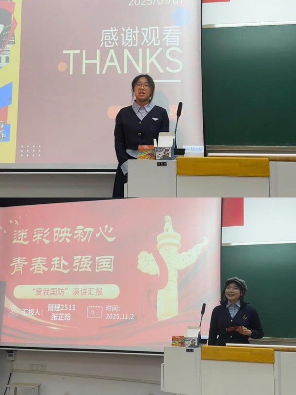 为激发青年学子爱国热情与国防意识,11月2日,管理学院于江宁校区D110举办“爱我国防”主题演讲活动。本次活动邀请了学生会主席赵筱宁,学习部部长张瑾韵、唐何玥担任评委,以“迷彩映青春,热血护家园”为主题,鼓励同学们结合强军热点与迷彩元素,用原创演讲抒发家国情怀。