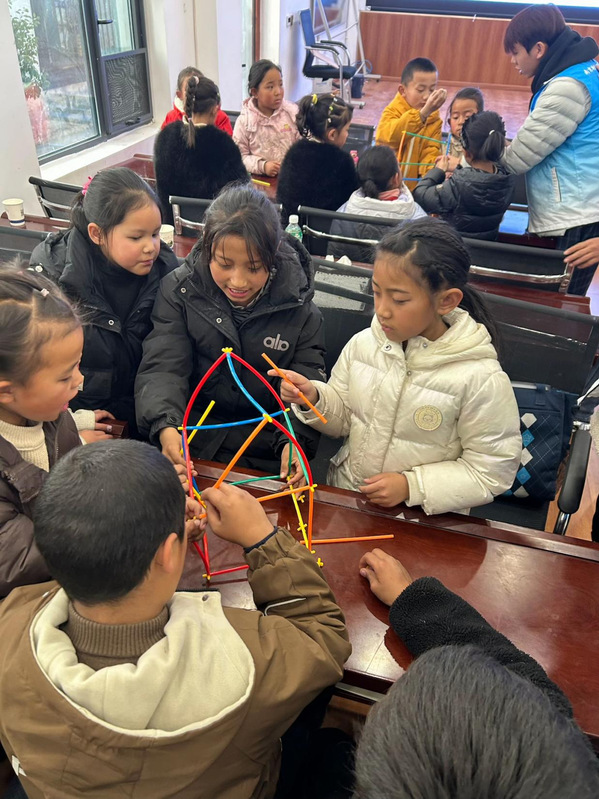 工程实践环节则点燃了孩子们的创造热情。志愿者以“高原小工程师”为主题,引导孩子们利用纸箱、吸管、胶带等废旧材料,设计制作“抗震小房屋”“简易输水管道”等模型。在动手过程中,志愿者耐心讲解结构稳定性、力学平衡等基础工程知识,鼓励孩子们大胆想象、反复尝试。当一座座充满创意的“工程作品”呈现在眼前时,孩子们的脸上洋溢着成就感。