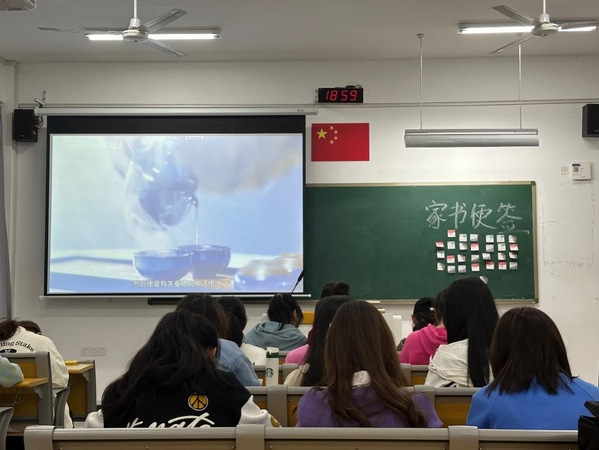 伴着重阳文化短片的播放,管院学子品尝着重阳糕和菊花茶。孕育着“人往高处走”、“步步高”、“事事高”美好祝福的重阳糕,让参与学生更加深刻地感受了传统的重阳风味。短片诉说着传统重阳节故事,教室里的每一个角落都弥漫着重阳节的氛围。我院学子深受感染,执笔在展板上写下一张张家书便签,共搭建友谊桥梁,一齐为亲友送上真挚的祝福,同分享心情和祝福。
