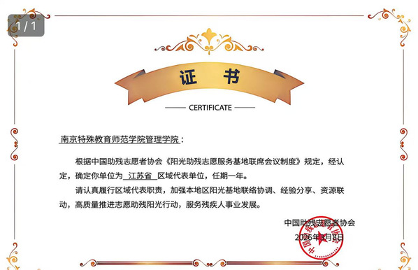 深耕融爱助残路,薪火奋进结硕果。近日,从中国助残志愿者协会传来喜讯。南京特殊教育师范学院管理学院成功获批江苏省区域代表单位。此次认定是为贯彻落实中共中央办公厅、国务院办公厅《关于健全新时代志愿服务体系的意见》,持续推进“志愿助残阳光行动”而开展的重要工作,经中国助残志愿者协会社会工作委员会收集资料、上报协会会长办公会审议通过,我院基地从众多申报单位中脱颖而出,这不仅是对基地多年来助残志愿服务工作的高度肯定,也标志着我院在推动残健融合与无障碍环境建设领域迈上了新的台阶。